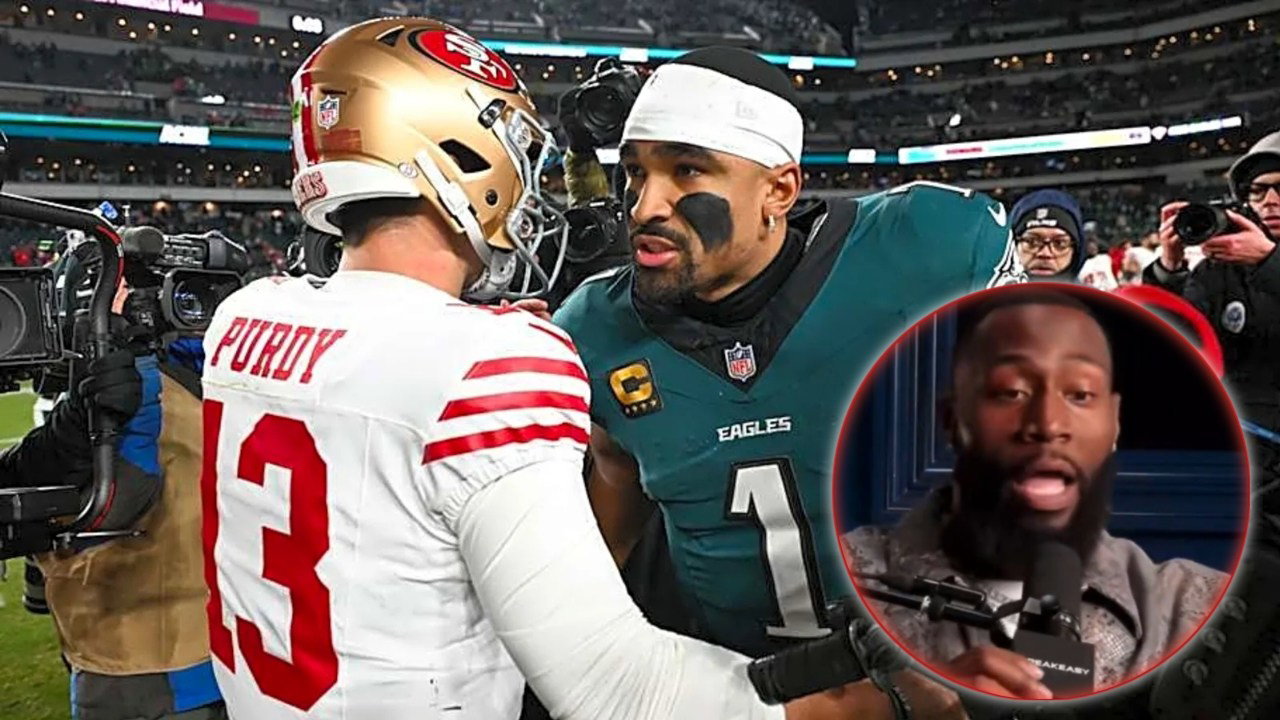 49ers quarterback Brock Purdy with Eagles quarterback Jalen Hurts and Charles Omenihu inside the circle (Image via IMAGO/Speakeasy)