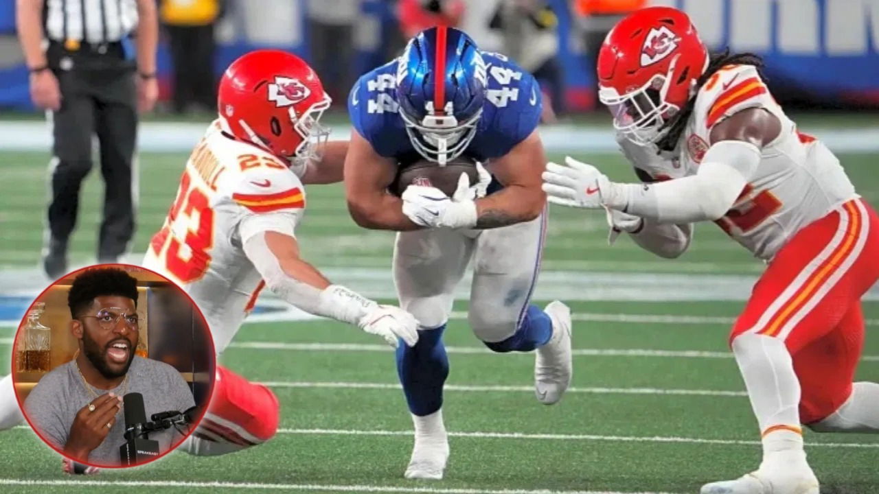 Giants running back Camm Skattebo splits two Kansas City Chiefs defenders and Emmanuel Acho inside the circle (Image via IMAGO/X)
